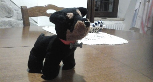 cucciolo di cane peluche, morbido e peloso cane di peluche nero e marrone. Occhi dolci. Tenuto in ottime condizioni. Possiede un collare rosso con medaglietta.